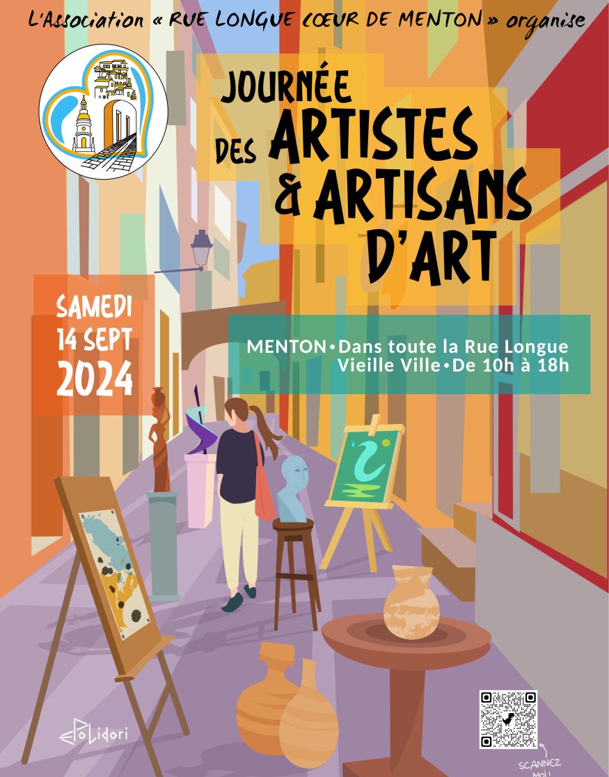 Vous invite chaleureusement à l'ouverture et à l'inauguration de sa Journée des Artistes, qui se tiendra dans la Rue Longue à Menton le 14 septembre 2024, de 10h à 18h.