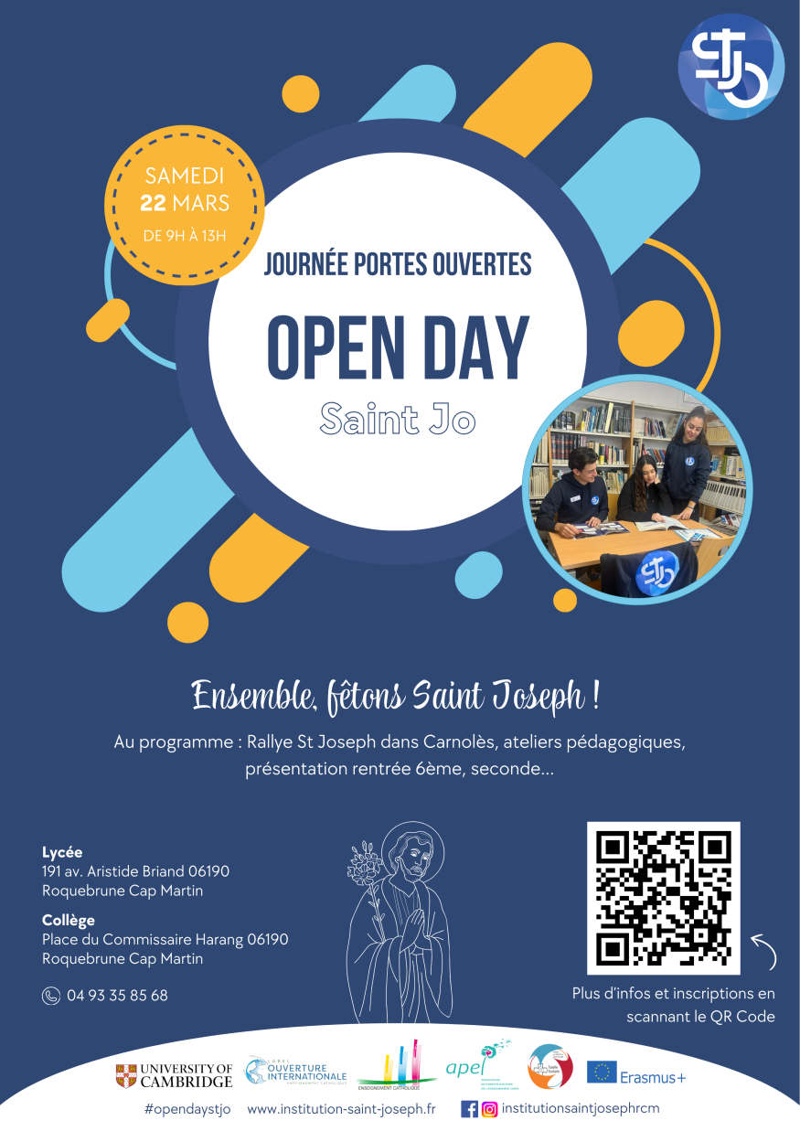 À l’occasion de la fête de la Saint Joseph, les familles seront invitées à participer à un rallye ludique et interactif pour découvrir le collège, le lycée et le quartier Carnolès. Chaque famille recevra un parcours personnalisé, leur permettant d’explorer les différents stands de l’établissement (options, spécialités, projets…) tout en allant à la rencontre des commerçants du quartier !