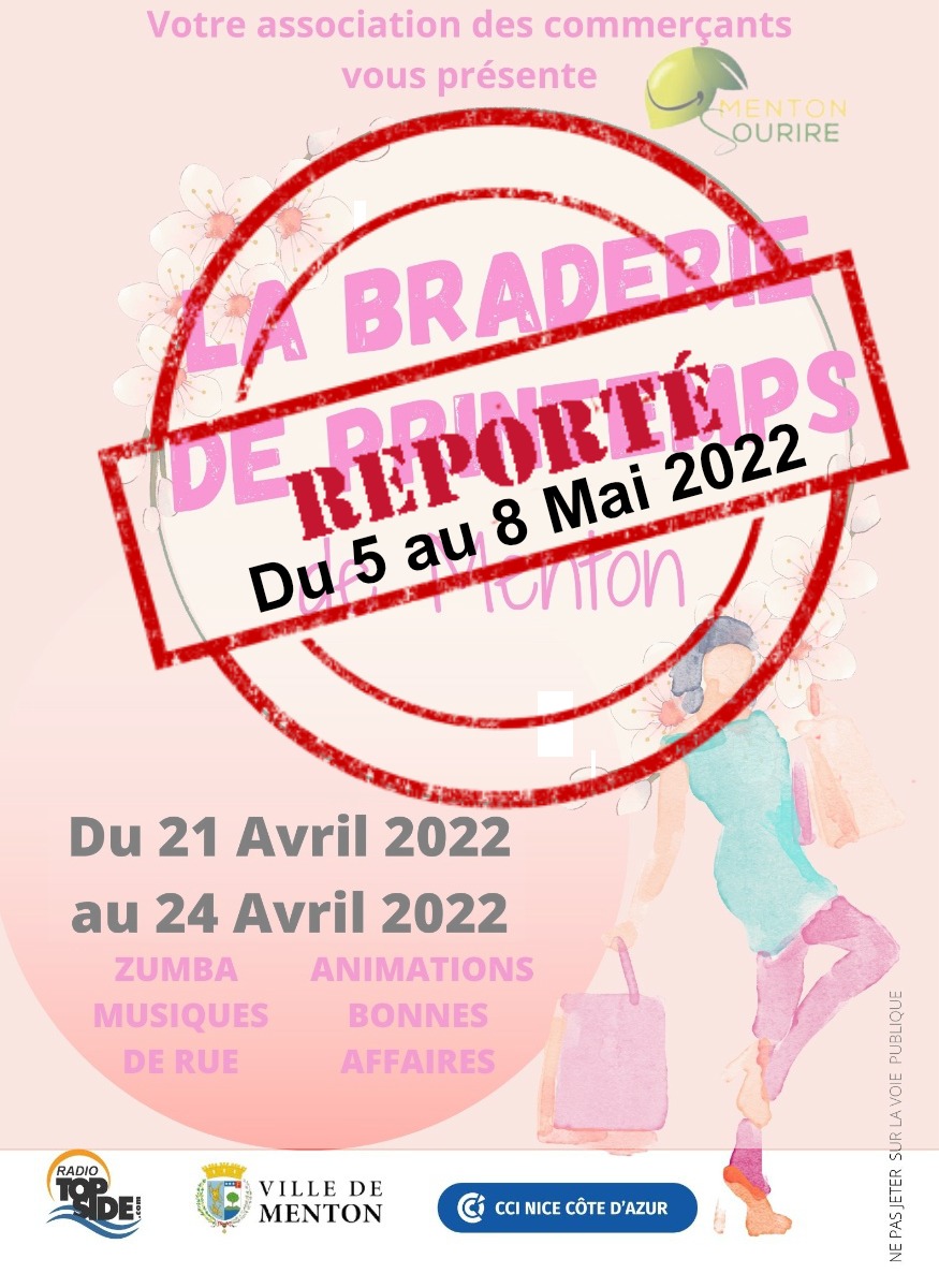 La grande braderie de printemps organisée par l'association des commerçants “ Menton sourir'' qui devait avoir lieu du 21 au 24 avril est reportée du 5 au 8 Mai suite au mauvais temps et la pluie annoncée par Météo France.
