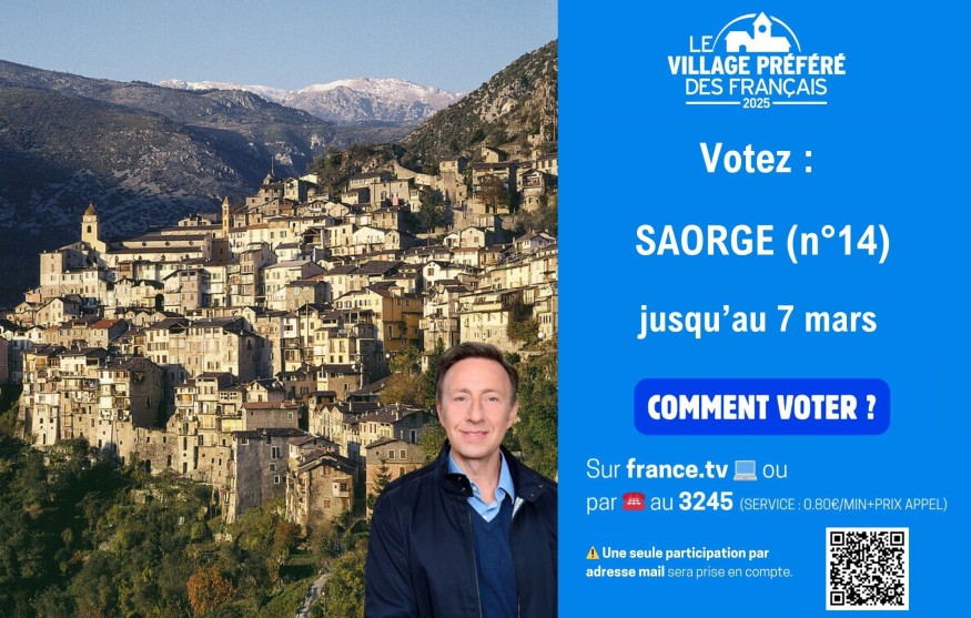 Pour soutenir Saorge (n° 14) et lui offrir le titre tant convoité, il vous suffit de voter sur le site de France Télévisions https://participez.france.tv/quiz/1557314_56/.html ou par téléphone au 3245 (service : 0,80 €/min + prix de l’appel). Partagez également l’information sur vos réseaux sociaux pour inviter vos amis à voter et faire découvrir ce village d’exception. Saorge, un village vivant, convivial et plein de charme, mérite d’être élu "Village Préférédes Français" 2025.