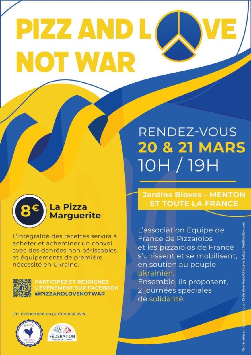 L’association Equipe de France de Pizzaïolos et les Pizzaïolos de France s'unissent et se mobilisent en soutien au peuple Ukrainien. Ensemble ils vous proposent 2 journées spéciales de solidarité.