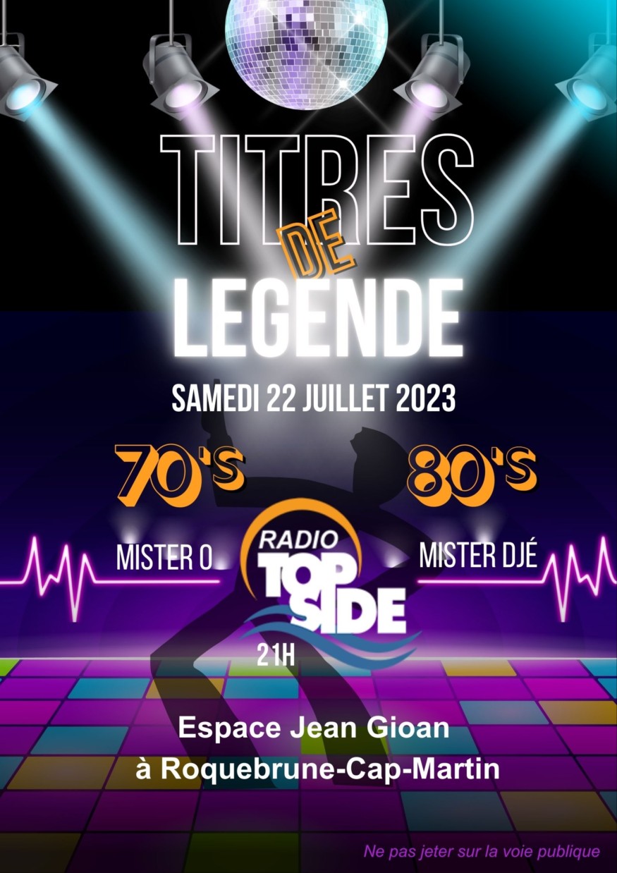 Les années 70 et 80 ont été marquées par l’émergence de la soul, du disco, du Funk. Pour vous amuser et vous faire rêver, les Djs Radio Top Side, Mister O et Mister Djé vous proposent de vous replonger le temps d’une soirée dans les souvenirs de vos plus belles années au son des titres de Légende le samedi 22 juillet sur l'espace Jean Gioan de Roquebrune Cap-Martin à partir de 21h30.