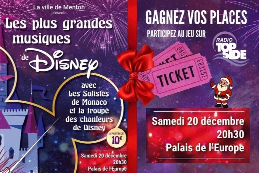 Radio Top Side vous offre 4 places pour le spectacle « Les plus grandes musiques de Disney »,au théâtre Francis-Palmero – Palais de l’Europe à Menton, le samedi 20 décembre à 20h30.