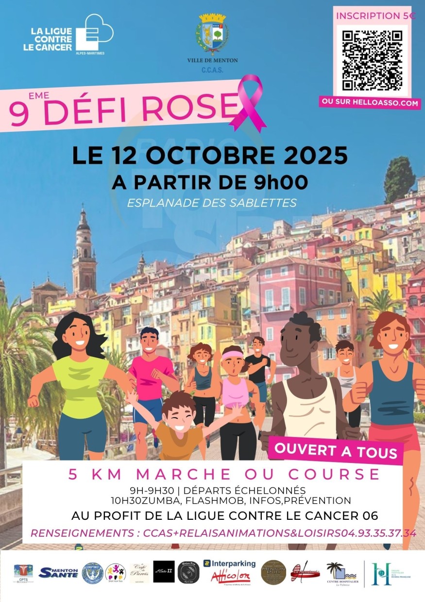 - 9h30 : départ des coureursTarif : 5 € (entièrement reversé à la Ligue contre le cancer 06)Inscriptions en ligne :www.helloasso.com/9eme-defi-rose-de-menton