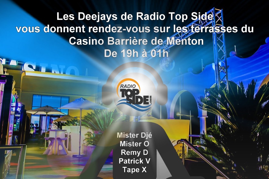 « SUMMER PARTY », c'est pas Fini ! L’équipe du Casino Barrière et les Deejays de Radio Top Side jouent les prolongations tous les Samedi soir avant de cloturer la saison estivale les Samedi 8, 15, 22 et 29 septembre de 19h à 01h sur son dancefloor en plein air, face à la mer, Cocktails, planchas, à partager, profitez-en ! Les Deejays de Radio Top Side vous donnent rendez-vous *Mister Djé *Mister O *Remy D *Patrick V *Tape X ENTREE GRATUITE Sur présentation d'une pièce d’identité Contact: CASINO BARRIÈRE MENTON 2 bis Avenue......