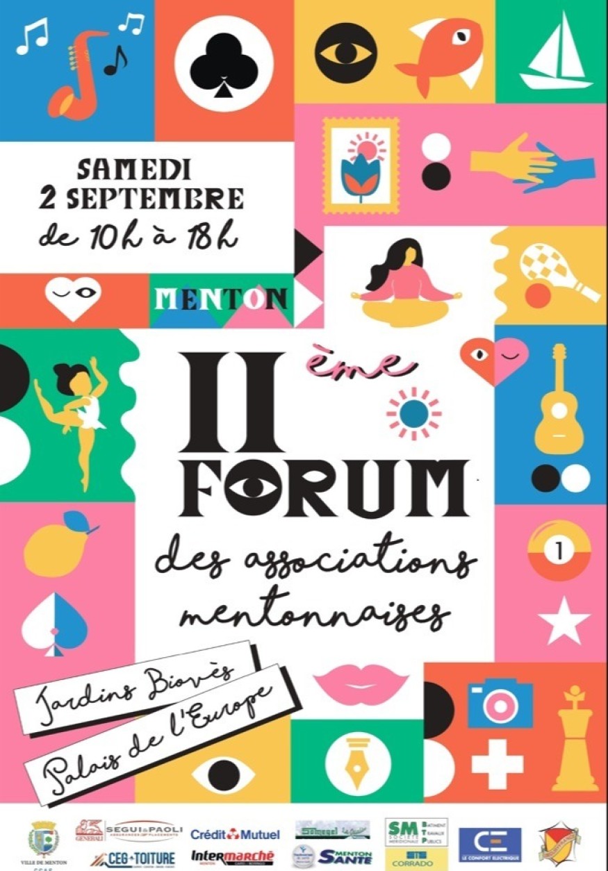 Le Forum des Associations est organisé par le CCAS de la Ville de Menton, en partenariat avec les assurances Generali - Segui et Paoli, le Crédit Mutuel, Intermarché Menton, Somegel, Menton Santé, SM BTP, Corrado, Le Confort Électrique, SecuryFrance et CEG Toiture.