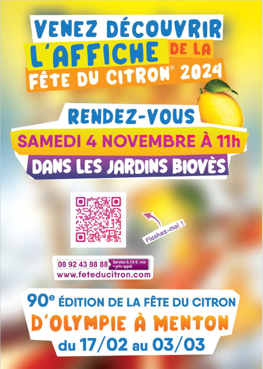 Et pour lancer officiellement cette 90e édition, rendez-vous samedi 04 novembre à 11h, devant le Palais de l’Europe, en présence de Yves Juhel maire de Menton et président de la Communauté de la Riviera française, aux côtés des élus du conseil municipal, pour le dévoilement officiel de l’affiche de la Fête du Citron® 2024 « d’Olympie à Menton » auquel est conviée la population mentonnaise.