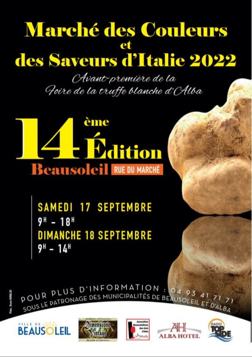 Un véritable voyage proposé par l'association beausoleilloise des amis d'Alba sous le patronage des municipalités de Beausoleil et d'Alba qui vous attendent Samedi 17 et  Dimanche 18 septembre 2022 à partir de 9h Décoration aux couleurs de l’Italie et animation musicale avec Radio Top Side permettront à tous les visiteurs d’être dans l’ambiance dès l’entrée du marché.