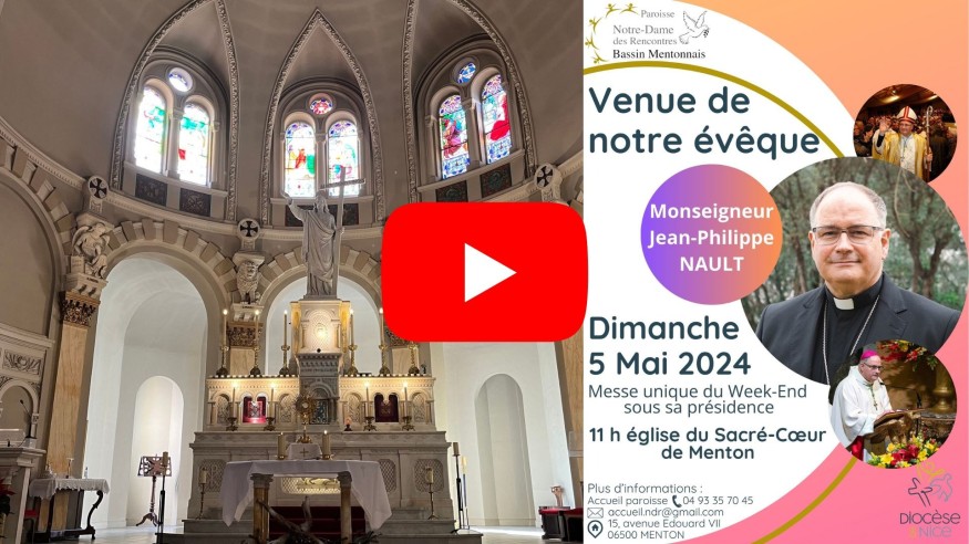 À l'occasion de la visite pastorale de Mgr Jean-Philippe Nault, une seule messe est célébrée ce dimanche 5 mai pour toute la paroisse Notre-Dame-des-Rencontres, à 11h à l'église du Sacré-Cœur à Menton. Célébration à vivre en direct. https://www.youtube.com/@ParoisseNotreDamedesRencontres
