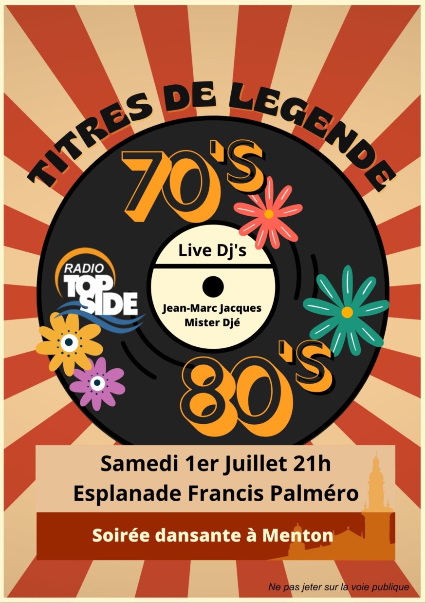 Les années 70 et 80 ont été marquées par l’émergence de la soul, du disco, du Funk. Pour vous amuser et vous faire rêver, les Djs Radio Top Side, Mister Djé et Jean-Marc Jacques vous proposent de vous replonger le temps d’une soirée dans les souvenirs de vos plus belles années au son des titres de Légende le samedi 1 juillet sur l’esplanade Francis Palmero à partir de 21h.