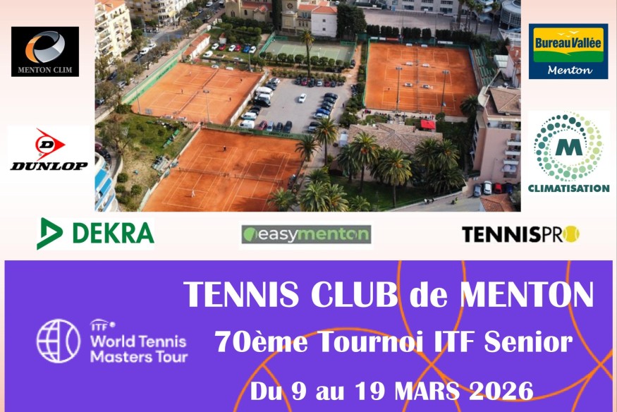 Du 9 au 19 mars 2026 Le Tennis Club de Menton est fier d’annoncer la 70ᵉ édition du Tournoi ITF Senior Grade 700, un rendez-vous incontournable du calendrier international, qui se déroulera du 9 au 19 mars 2026. Un tournoi international d’exception Cet événement emblématique réunira près de 300 joueurs, âgés de 35 à 85 ans, venus d’une trentaine de nationalités. Tous auront le privilège d’évoluer sur l’une des plus belles terres battues de la riviera, reconnue et appréciée par les joueurs eux-mêmes. Un atout pour Menton et sa région Avec environ 2500 nuitées ...