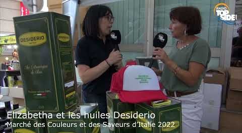 Elizabeth, nous présente ses huiles Desiderio au micro de Nadine Torcolo. En direct sur Radio Top Side du Marché des Couleurs et des Saveurs d’Italie 2022. 14eme édition du marché Marché des Couleurs et des saveurs d’Italie à découvrir rue du Marché à Beausoleil sur le week-end du samedi 17 et dimanche 18 septembre 2022. De belles surprises à découvrir avec des produits originaux, des odeurs, des couleurs et des saveurs d’Italie, fromages, charcuteries, pains, gâteaux… Un véritable voyage proposé par l'association beausoleilloise des amis d'Alba sous le patronage des......